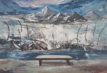 The drive from the distant Atlantic coast — Europe’s westernmost edge — to the mountain range straddling Spain and France was long and dull. Crossing Spain by car, especially through the night, feels endless. When we finally arrived, I was astonished by how many people there were in the middle of a mountain. And after half a dozen hard falls, I quickly learned that snowboarding isn’t exactly easy for a middle-aged beginner. After two or three days, I realized this wasn’t my element. What I truly wanted were solitary walks in nature — not at high altitude, but a little lower down, where the landscape is more hospitable. So that’s what I did. I asked a friend to drop me off in a small village and rented a modest cabin with a single window — but from that window, I had a splendid view of the mountains. It turned out to be a remarkable experience. My days followed a simple rhythm, focused on exploring the surroundings. I spent most of my time walking, and I’m certain that’s where the painting Eagle Vision was born. I often saw a shadow circling high above — an eagle, no doubt — observing that tiny moving dot in the landscape that was me. I met a shepherd there several times, and we had long talks. He told me about mountain myths, about whispers carried by the wind, and about the mysterious hand of a high-altitude god who decides the fate of those who wander into his domain. The impact of that trip was profound. Even now, I sometimes dream that I’m back there, caught in some peril, and I wake half-dazed — relieved, yet with the lingering sense that I’ve just escaped something terrible.