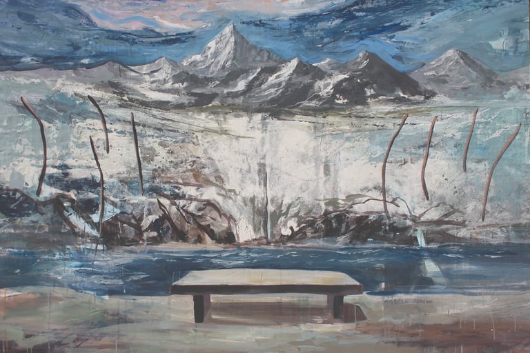 One of the most fascinating aspects of painting is its ability to be seen in countless ways. I’ve come to realize this over the years, every time I show my work. I always hear a wide range of interpretations — each one revealing what others believe they see. Even in my studio, when friends drop by, our conversations often circle around the paintings. Sometimes an outsider’s reading is completely opposite to my own, and that difference always makes me think. No matter how concrete or seemingly objective an image is, it’s almost impossible to reach a true consensus on what it represents. Even when opinions stay close to the main idea, they inevitably diverge at some point. The more subjective the work, the softer its contours, the broader its meaning — and the richer the interpretations become. That margin of uncertainty is fertile ground, where the formal and expressive dimensions of painting intertwine in unexpected ways. Like many of my works, this one has its roots in earlier paintings. The most prominent element from that period is the mountain — a theme that had fascinated me ever since I visited the Pyrenees a few years earlier. It was a remarkable experience, and very different from what I had imagined. Looking back, I realize that I was going through a turbulent time then, my personal life unsettled by a series of events beyond my control. So, when some friends invited me to join them on a snowboarding trip to the mountains, I thought it might be a good way to clear my mind. I had no idea what I was getting into.