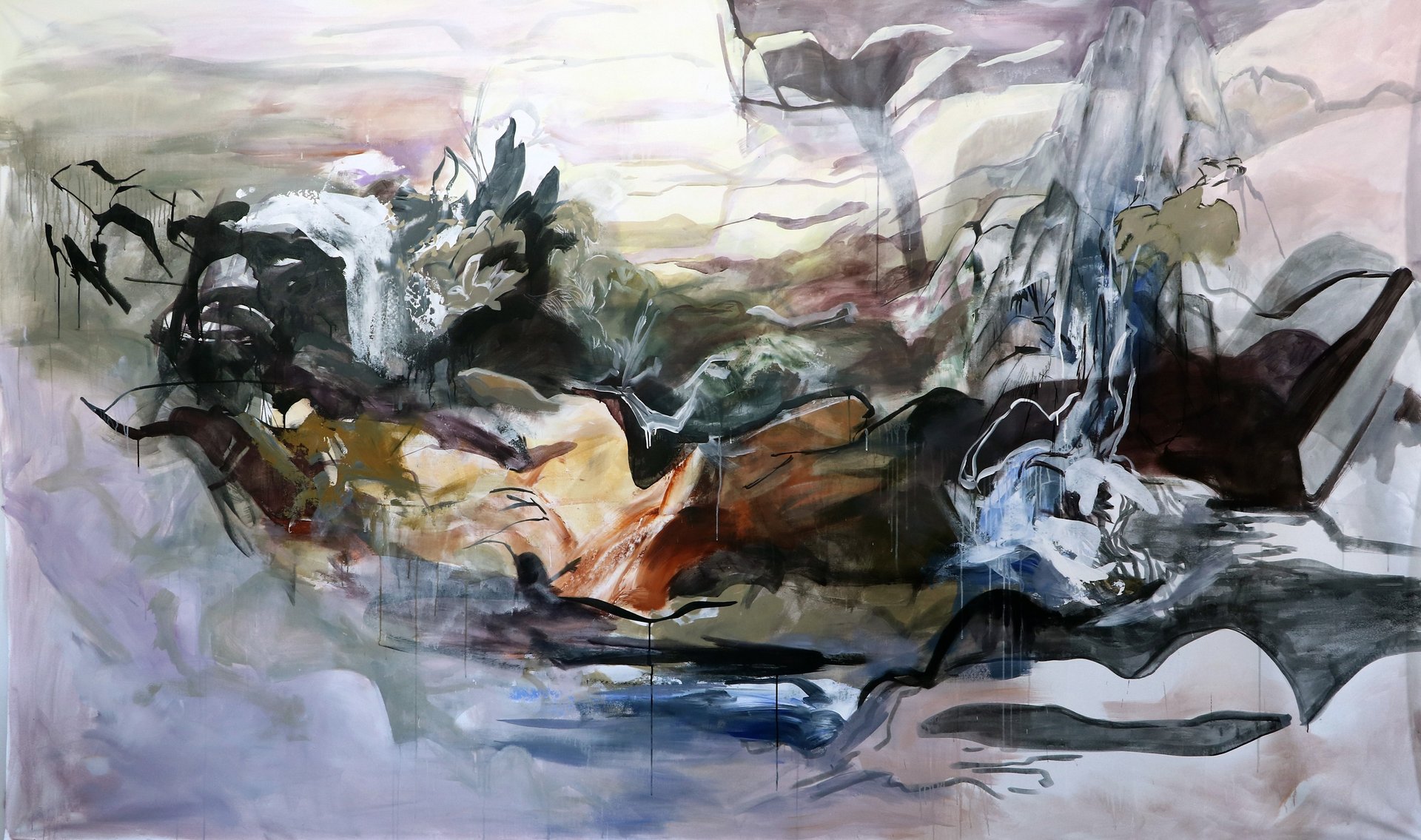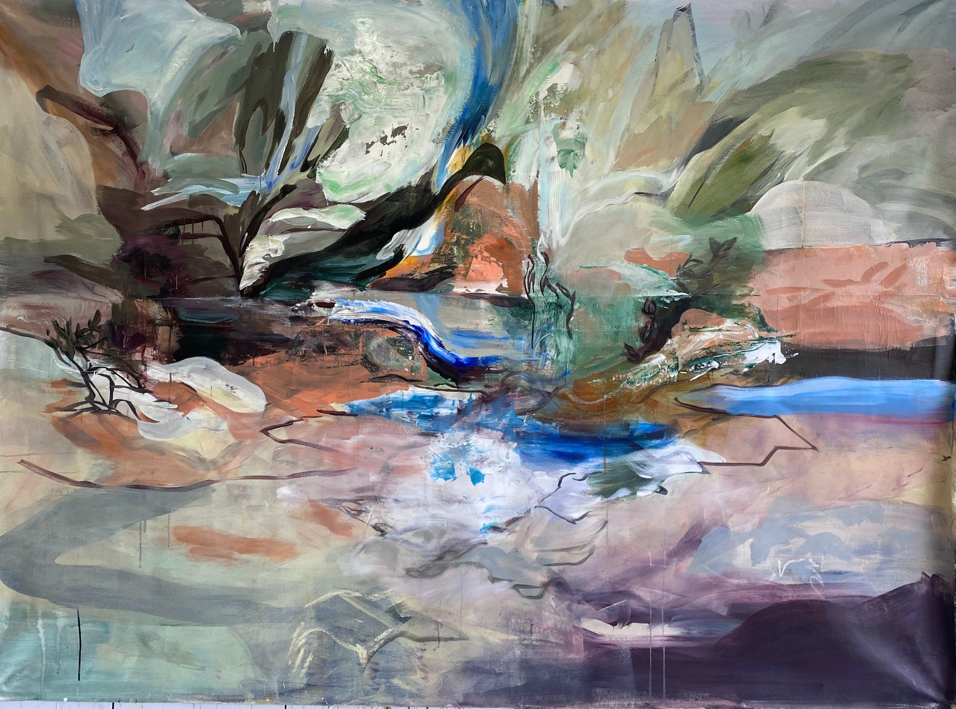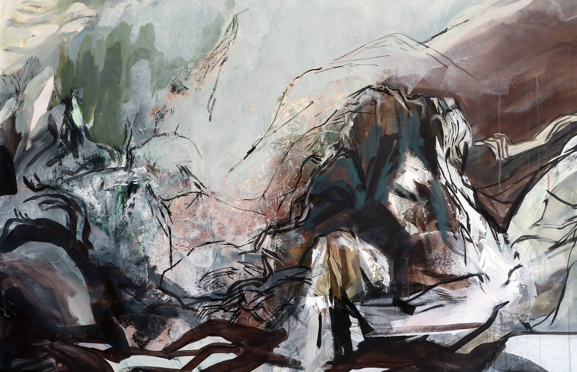 The fact that I started working there gave some interesting results because I realized that I was being permeable to that influence in the way I was doing things. Initially it was the need to work in large formats, I needed scale, to feel immersed in the painting as I felt immersed when I went for walks in the surrounding area. At the time I had a set of already painted canvases that were the result of previous phases and which I decided to reuse using the back of the canvases which was raw cotton fabric. Most of the works started to have two faces, the front and the back and that alone brought a new dimension because working on raw canvas requires another approach and allows us to take advantage of the fabric's absorption capacity like paper, which It allowed me to use charcoal and Indian ink together with acrylic paints and with that I established a connection with the work of previous years in which I used paper.